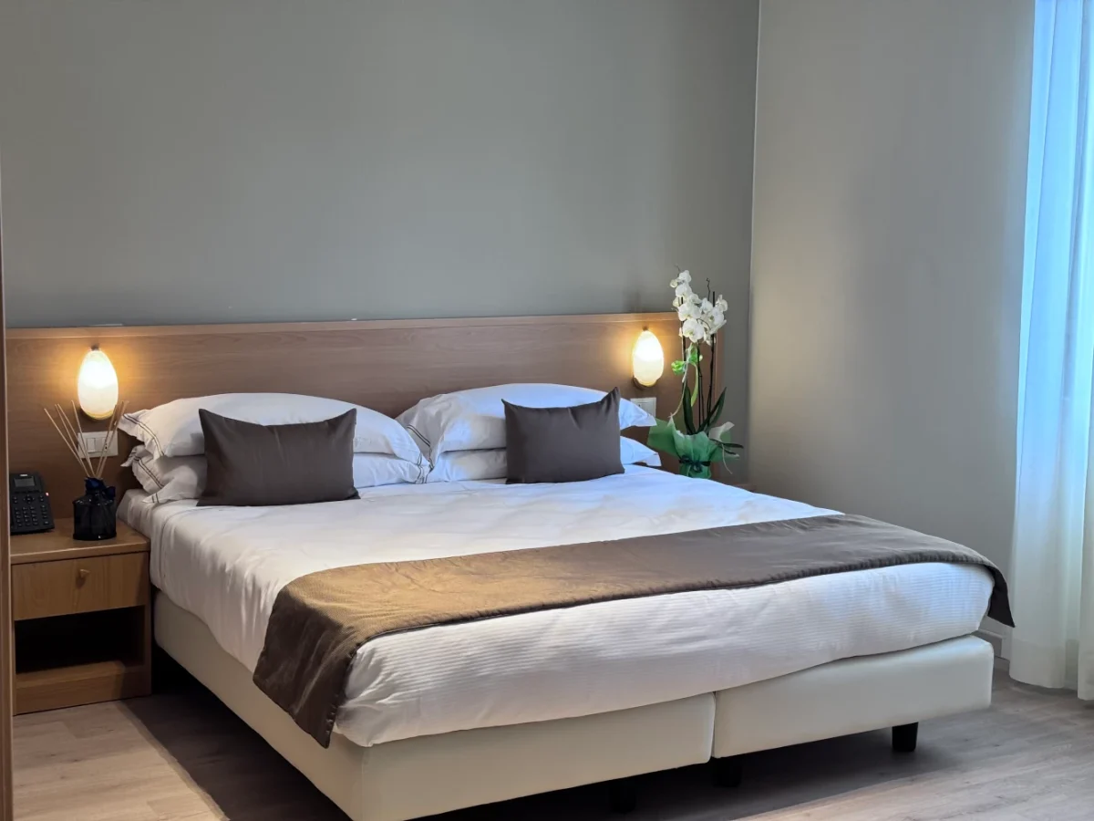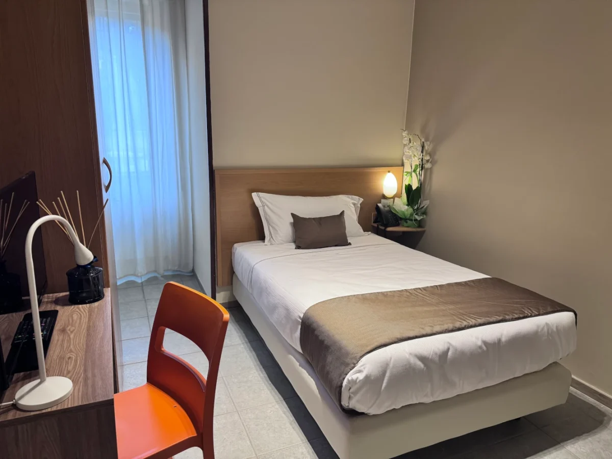 The Superior Single Room, approximately 13 sqm, is ideal for business stays. Featuring parquet flooring, a private bathroom renovated in 2024 with a shower cubicle, and a double bed with sommier, it offers comfort, practicality, and modern design for a pleasant and relaxing stay.